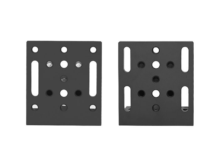 这款直角转接件具有互成90°的前后面板,非常适合需要构造垂直定位的三维光机械系统。前表面有4处6.1*22.1mm通孔槽、7处M6螺孔和2处φ6.3mm沉头孔。底面板包含2处6.1*31.1mm的通孔槽、10处M6螺孔和2处φ6.3mm沉头孔,用于安装到光学平台。