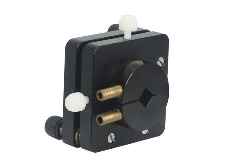 晶体水冷调整架可实现对晶体的俯仰和转摆(θXθZ)微调,安装晶体的镜筒内部有水冷槽,可以通过两个水接口连接外部水源对晶体进行冷却。使用时,直接将晶体嵌入安装的方孔,用螺丝锁紧,靠四周抱紧晶体,然后将装有晶体的镜筒旋进调整架主体即可。安装晶体的镜筒内部有水冷槽,可以通过两个水接口连接外部水源对晶体进行冷却。