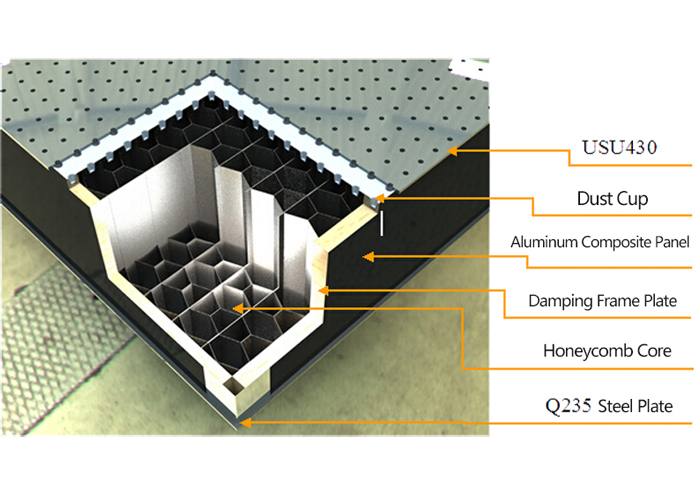 蜂窝结构隔振台板,能提高实验的精度、提供坚固安装的作用,其结构为蜂窝空心结构,包括上下面板、隔离杯和蜂窝状芯板;便于实验附件的固定安装,面板采用高导磁不锈钢(430),表面不生锈,保证了实验室清洁度;可防止噪音在内部产生震荡给实验造成误差,同时能防尘、防水、防止小物品坠落到内部,便于清理;内部蜂窝状芯板采用的是梯形薄钢板相互対粘中间并夹有钢板形成的像蜂巢形状的结构,它能在降低芯板质量的情况下使刚度变好。