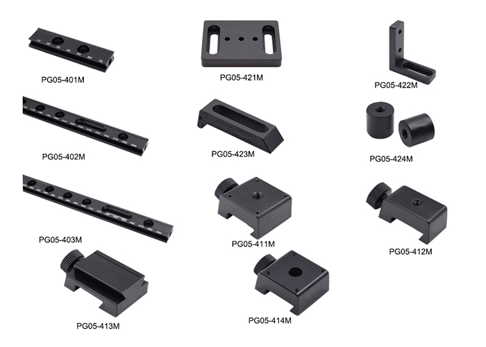 PG05-421M底板两侧带2处长25mmU型槽,使之可安装于光学平台上。中心含3处M4用反向沉孔,可与GCM-7204系列燕尾导轨连接,使其垂直安装于底板之上。