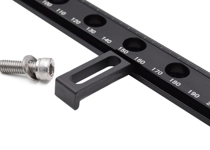 燕尾式导轨具有多个M6沉头孔,以实现安装的灵活性。每个导轨端部的M4螺纹孔可用于垂直安装。并配备一个M4-φ6的圆柱销,可与另一个导轨端部φ6的孔对接,以实现多个导轨间的延长对接,实现初定位。导轨标有激光刻度,分度为1.0 mm,且每隔10.0 mm具有数字标记,用于精确放置光机械硬件。