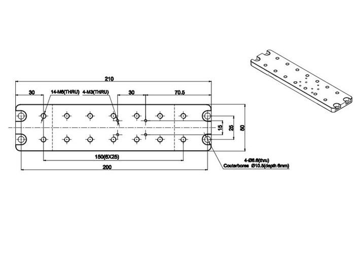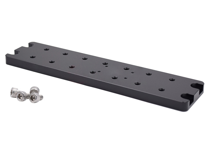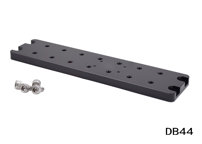 DB44是一款支杆座,外形尺寸为210mm*50mm*9mm;主要用于位移台连接到孔距为200mm*25mm的平台上,其中孔距为30mm*15mm的M3螺纹孔。